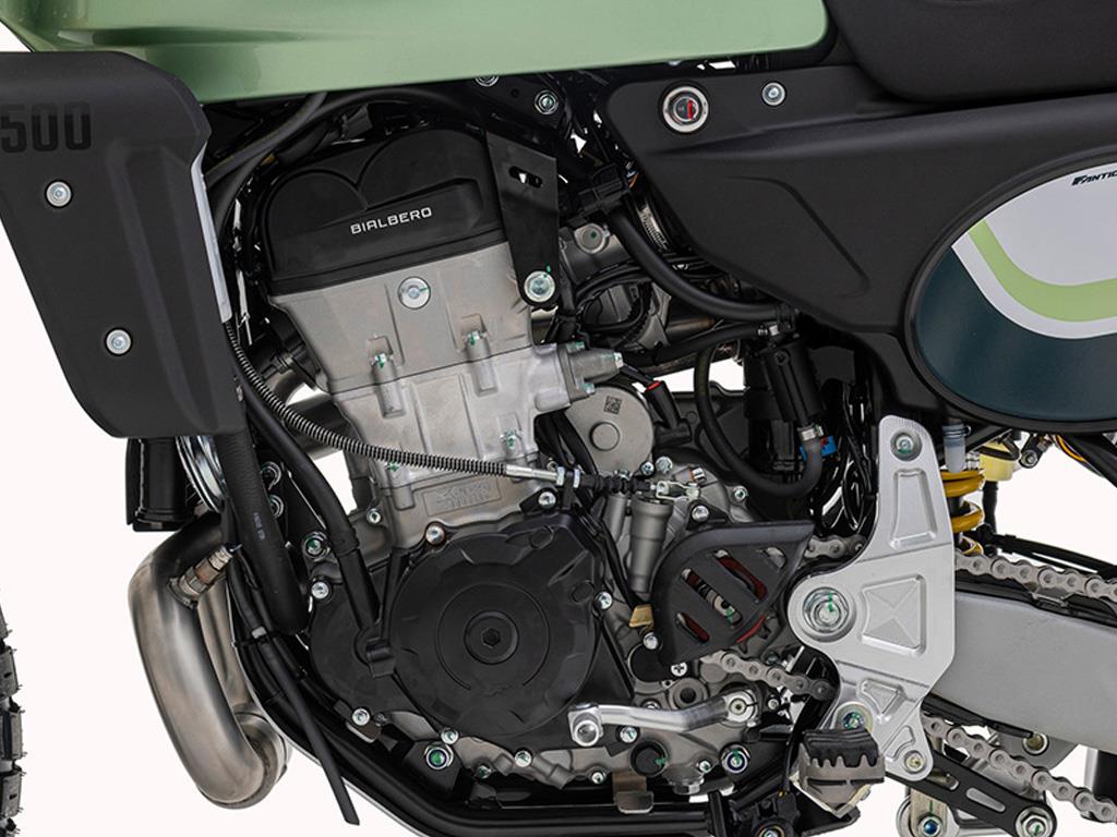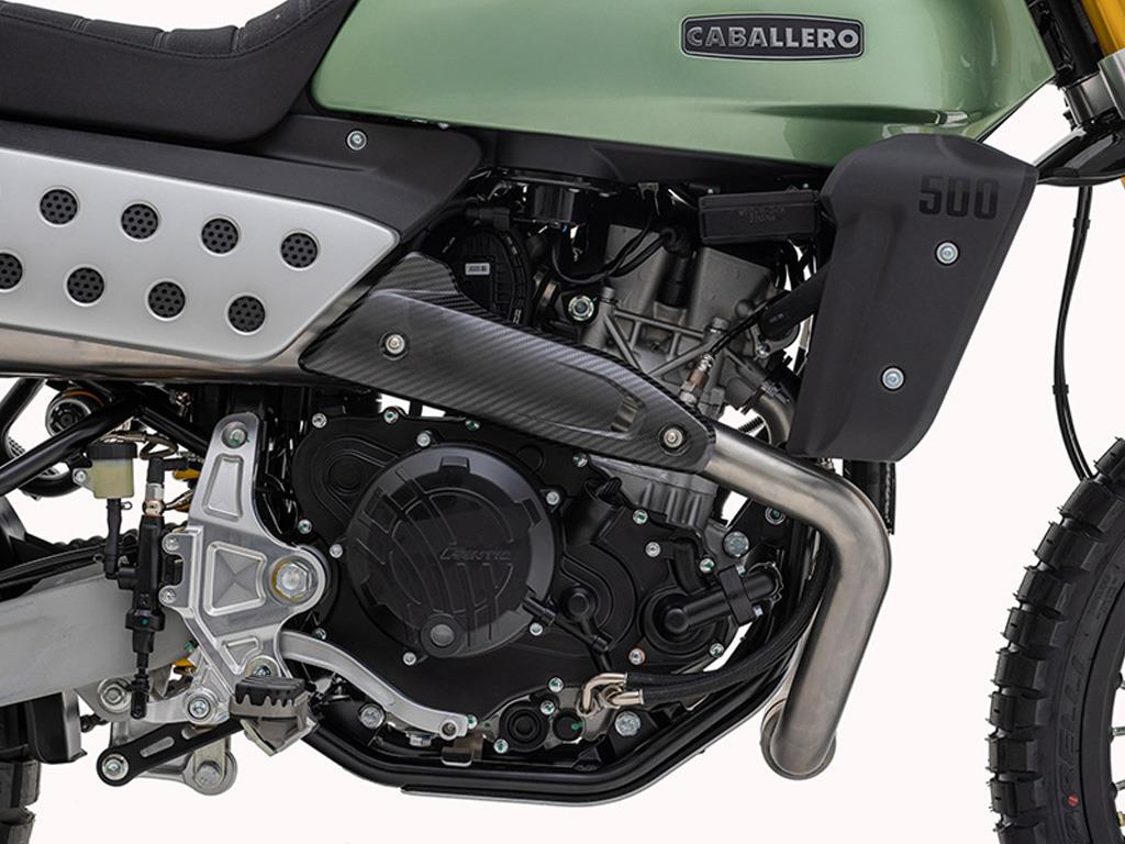 The Caballero 500 Rally is equipped with a new 460cc DOHC single-cylinder engine, developed and produced by Motori Minarelli — an Italian heart that delivers outstanding performance and an exciting ride, built to tackle any off-road challenge with power and reliability. An engine that embodies the passion and excellence of Italian motorcycling tradition.