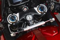 Öhlins Nix EC hydraulic “upside down” front forks with TiN superficial treatment. Completely adjustable with electronically controlled compression and rebound damping with manually controlled spring preload. Fork dia. 43 mm (1.69 in.)