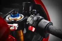 The braking system is of the highest quality, with MV Agusta relying on Brembo for superior performance. It includes 320mm front discs with aluminum flanges and radial Stylema calipers with 30mm pistons, operated by a Brembo radial master cylinder. At the rear, a 220mm disc with a Brembo 2-piston caliper with a 34mm diameter ensures balanced stopping power. The ABS system, with cornering and Rear Lift up Mitigation (RLM) functions, manages the braking power with two levels of intervention: Sport and Race.